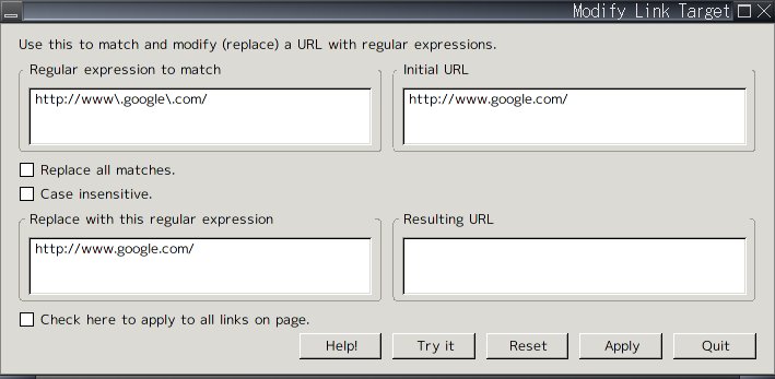 それで、選択したエレメントを削除したりとか CSS の属性値を変更したりとか色々機能があって何だかんだ言って便利なんですが、その中の Modify URL って言うハイパーリンクを変更する機能が高機能でスゲェんですよ。ヘルプを見ても「正規表現でURLが変更出来る」としか書いてなくてこの突き放しっぷりが素敵なんですが、さすがにこれじゃ使えてる人いなそうなのでここに解説します。