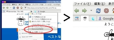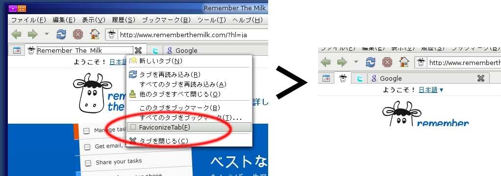 インストールするとタブのコンテキストメニューに「FaviconizeTab」と言うのが追加されるので、それをクリックするとタブの幅が favicon のサイズまで小さくなります。もう一回 FaviconizeTab をクリックすると元に戻るっていう寸法。