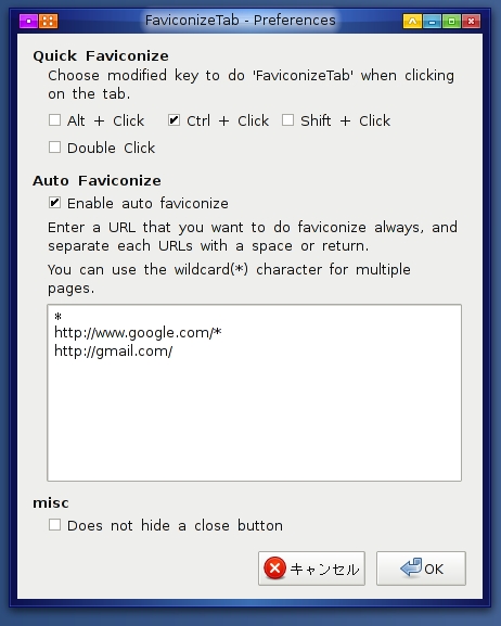 タブに閉じるボタンを付けるver.0.9.8 からオプションで指定できるようになりました - マウスジェスチャを使って faviconize