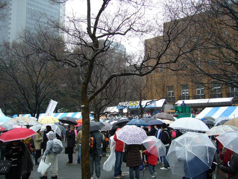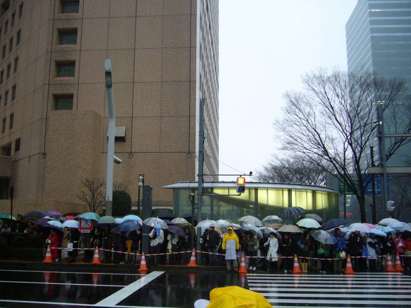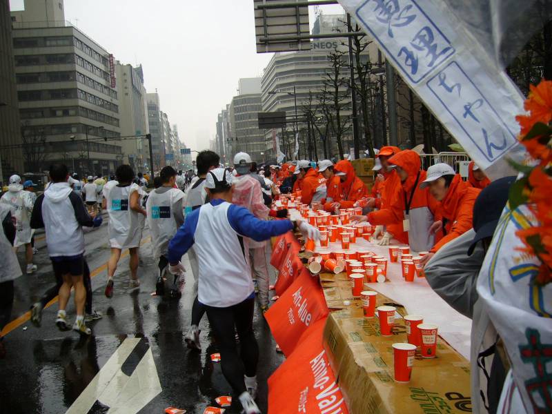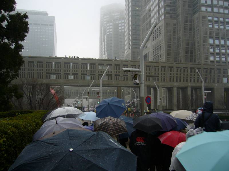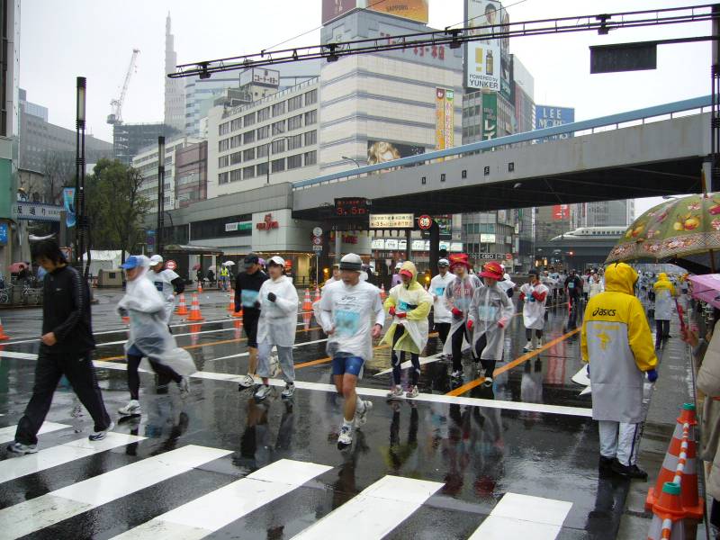 さっぱり前が見えないので、スタート地点から遠く離れた場所で初陣の選手を応援する事にしました。歩いても歩いても人が途切れない…。1km くらい歩いて、ようやくすき間を発見して収まる事が出来ました。雨が振ってたせいで、傘が邪魔過ぎて切れそうになりました。