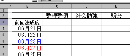 「前回達成度」っていう項目は最近追加しまして、前に使った表での達成率を入れたりしています。今回はどの項目に力を入れようかなんてのも考えたり出来て楽しいです。