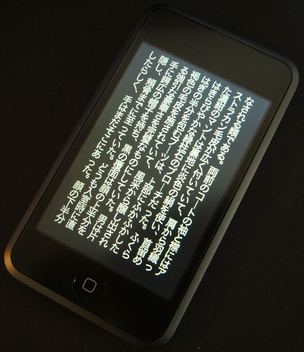 iVBook っていうのを入れると縦書きで文書が読めるって言うので入れてみました。入れる前は、touch で読書とかってどうなんだろうなと思ってたんだけど、やってみるとこれは意外と読みやすい。画面がすごく綺麗なので、読んでで疲れない、気がする。(写真クリックでデカイ画像も見れるようにした)