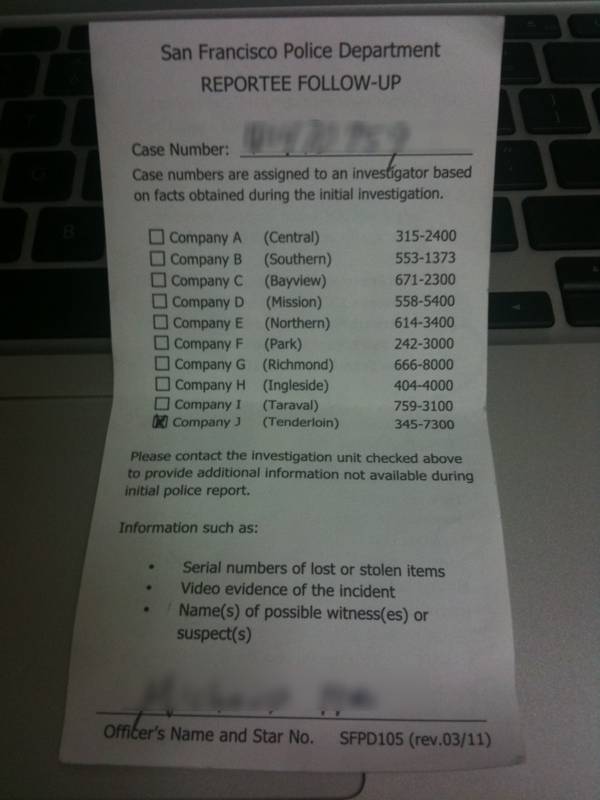 待つこと約一週間。封書が届きました。クレジットカード番号や事故の詳細、振込先口座や被害金額などを書いて、パスポートの入出国欄のコピーと、そして重要なのが事故証明書の添付。僕の場合は、サンフランシスコ警察の人にCase Numberっていう番号が書いたレポートを貰っていたので、それを添付しました。